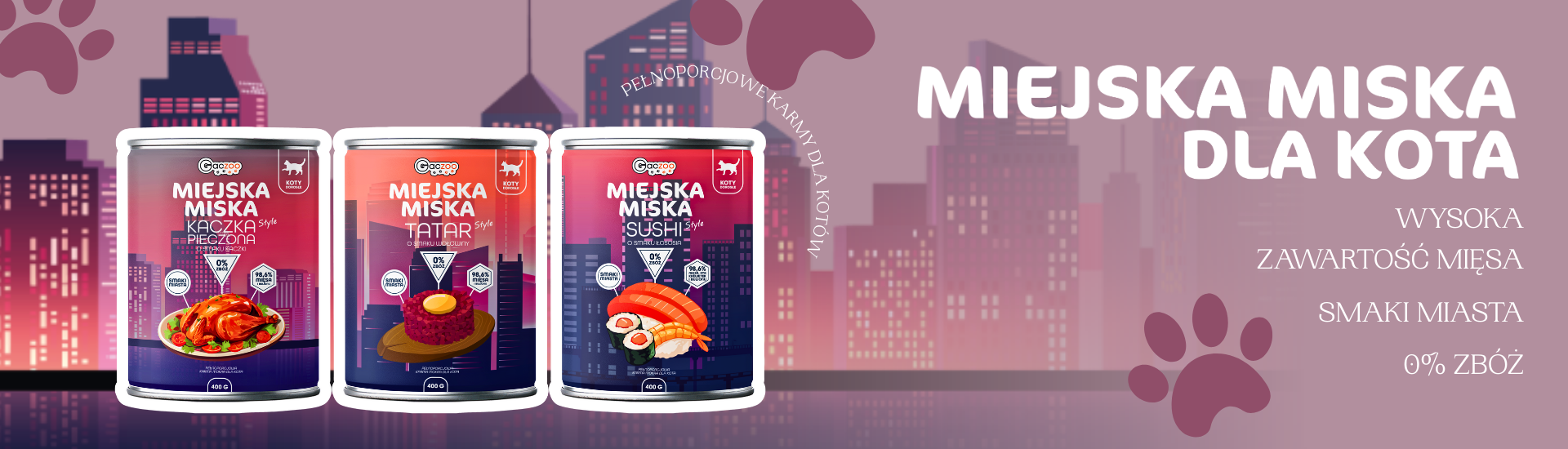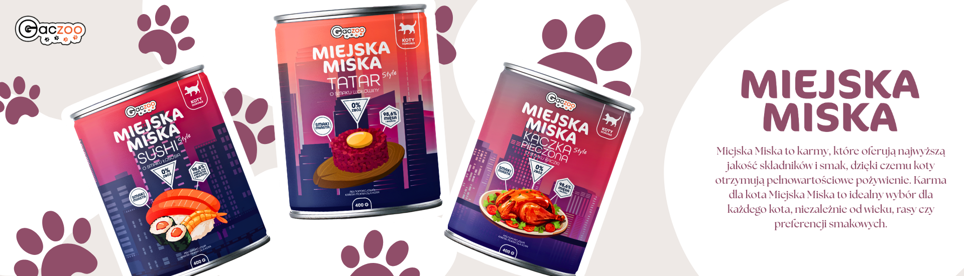 Gaczoo Miejska Miska to polska odpowiedź na nudę w kocim jadłospisie. Twórcy marki wyszli z założenia, że skoro my – opiekunowie – celebrujemy posiłki, jedząc sushi czy tatara, dlaczego nasi pupile mają być gorsi? Tak powstała linia karm mokrych, których nazwy brzmią jak menu z dobrej restauracji, a skład pozostaje w 100% wierny biologicznej naturze kota jako bezwzględnego mięsożercy.